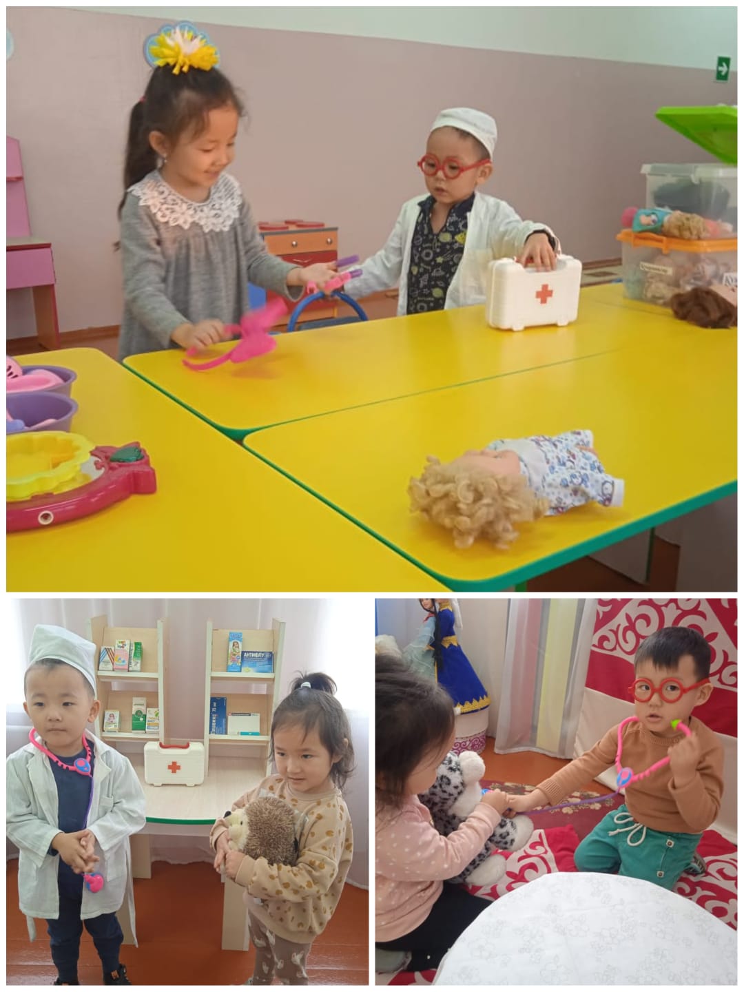 15 наурыз 2022 0 1 2 3 4 5 "Балдырған" ортаңғы тобы Тәрбиеші: Тулегенова Умиткул Курмангалиева Тақырыбы: "Емхана" сюжеттік-рөлдік ойынМақсаты: Өздіктерінен рөлдерді бөле білуге үйрету. Бір-біріне деген қамқорлыққа баулу.