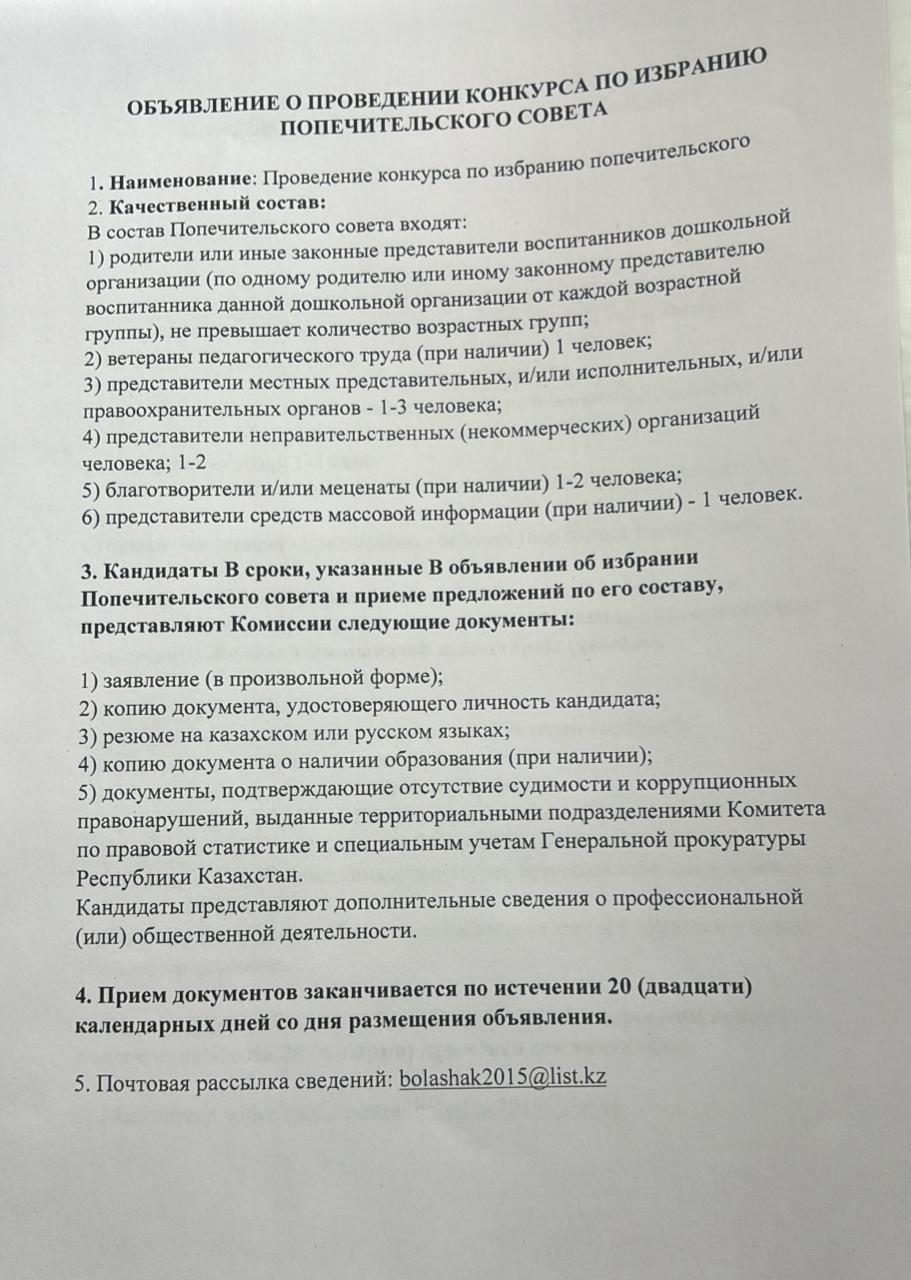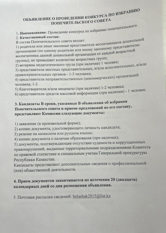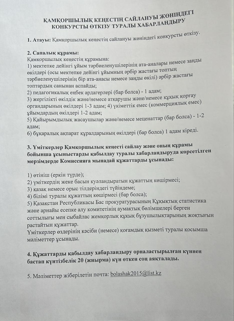 Қамқоршылық кеңестің сайлануы жөніндегі конкурсты өткізу туралы хабарландыру!