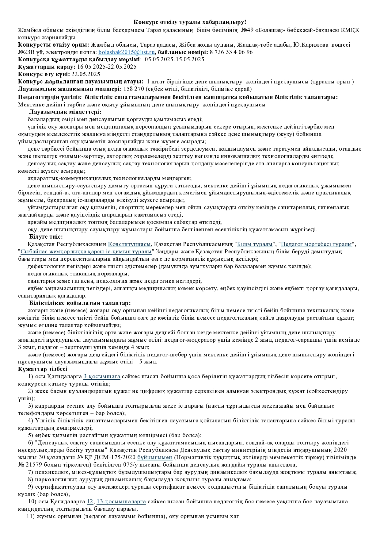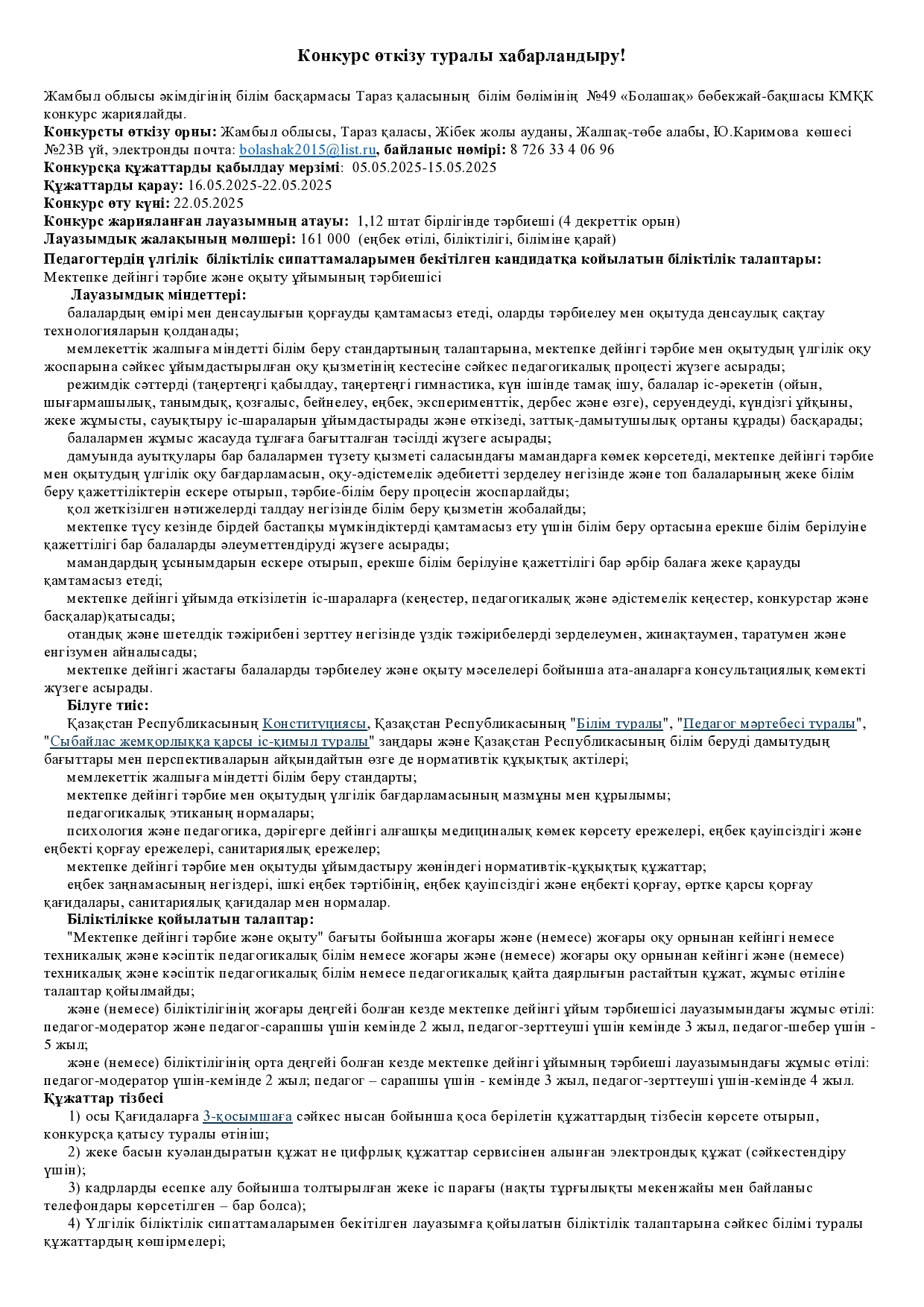 ХАБАРЛАНДЫРУ!!! МУЗЫКА ЖЕТЕКШІСІ, ДЕНЕШЫНЫҚТЫРУ НҰСҚАУШЫСЫ, ТӘРБИЕШІ