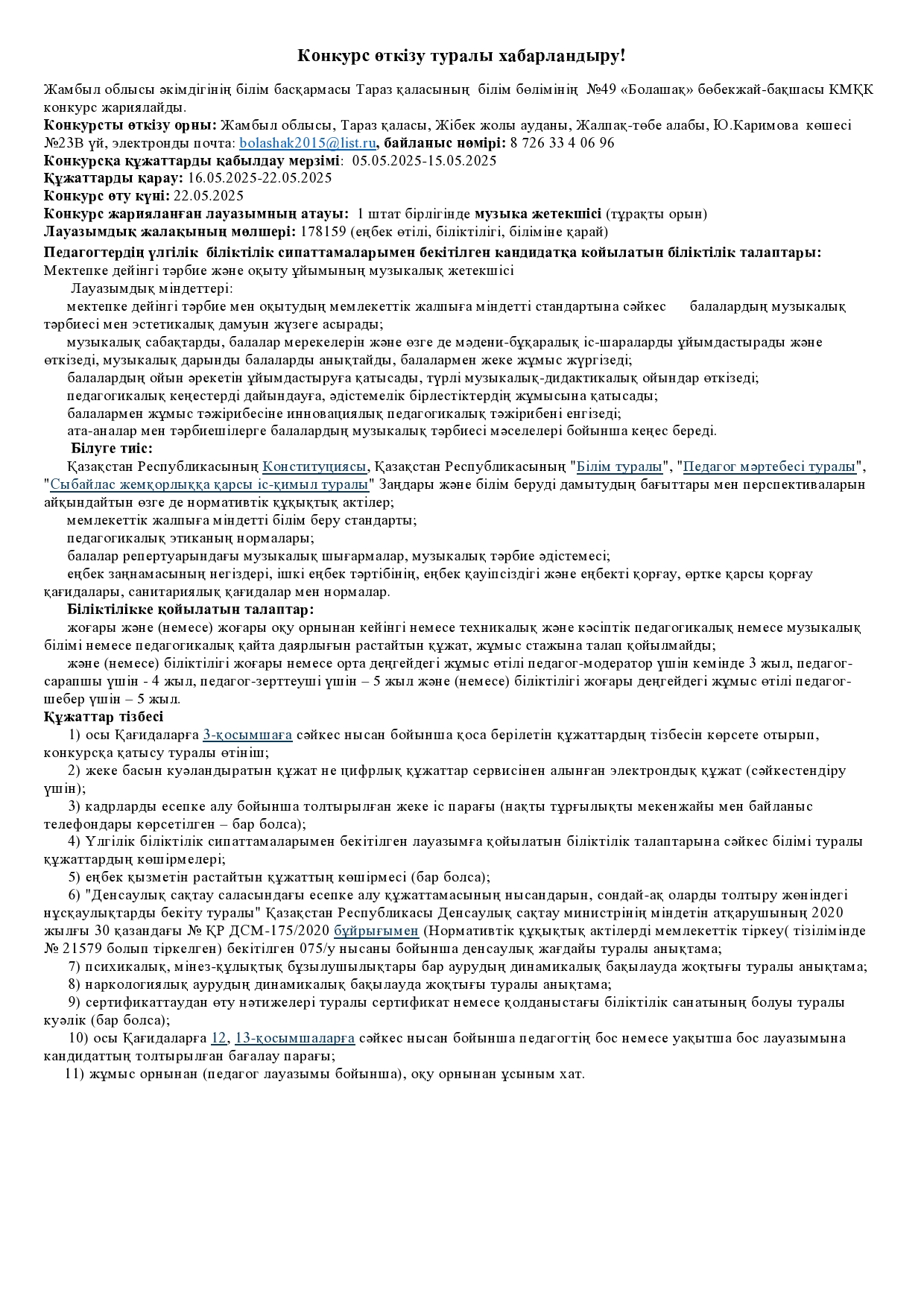 ХАБАРЛАНДЫРУ!!! МУЗЫКА ЖЕТЕКШІСІ, ТӘРБИЕШІ, ДЕНЕШЫНЫҚТЫРУ НҰСҚАУШЫСЫ