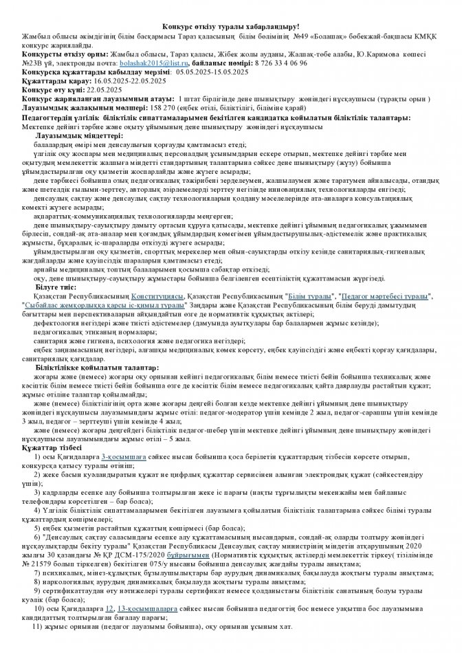 » ХАБАРЛАНДЫРУ!!! МУЗЫКА ЖЕТЕКШІСІ, ТӘРБИЕШІ, ДЕНЕШЫНЫҚТЫРУ НҰСҚАУШЫСЫ